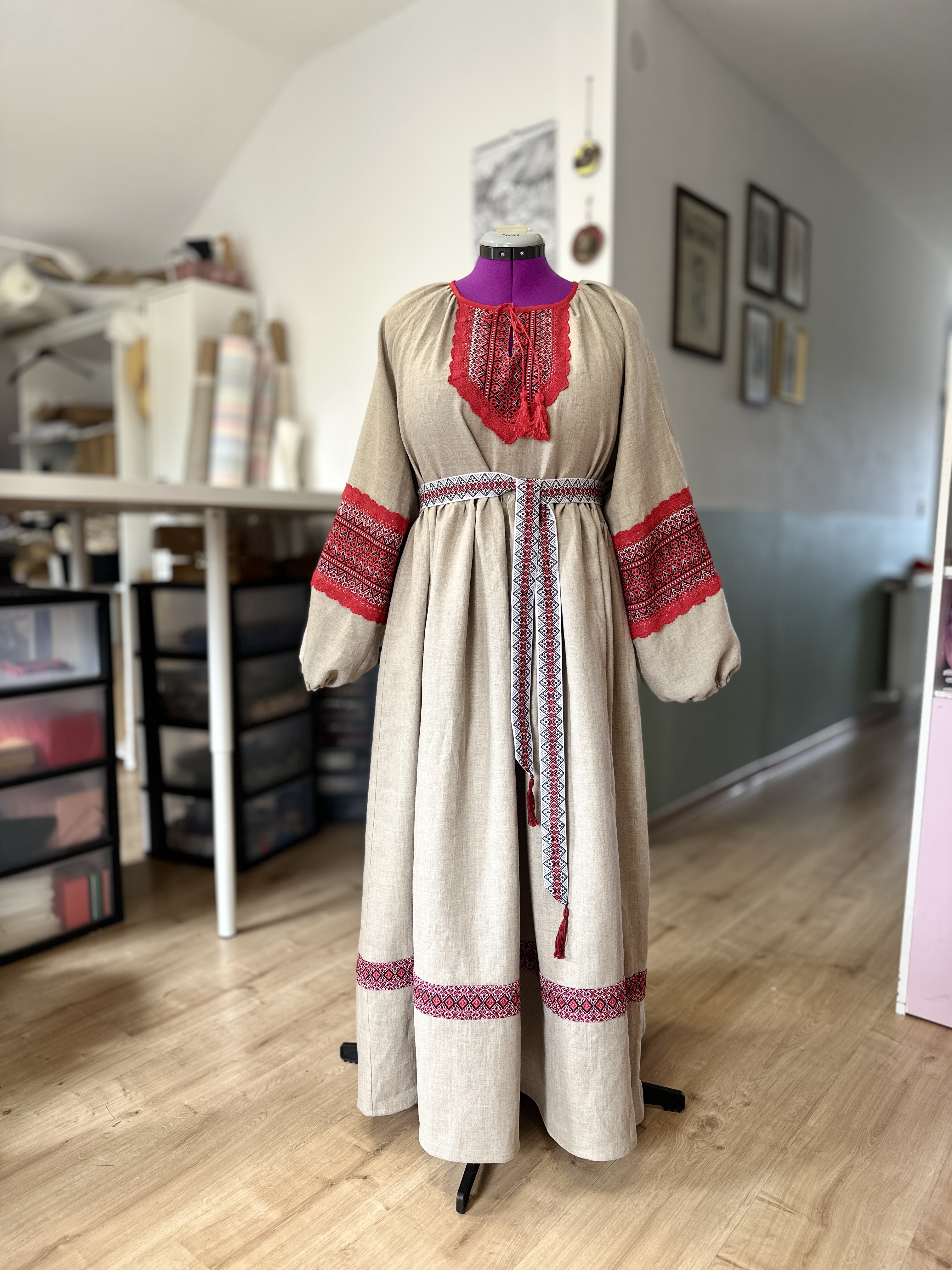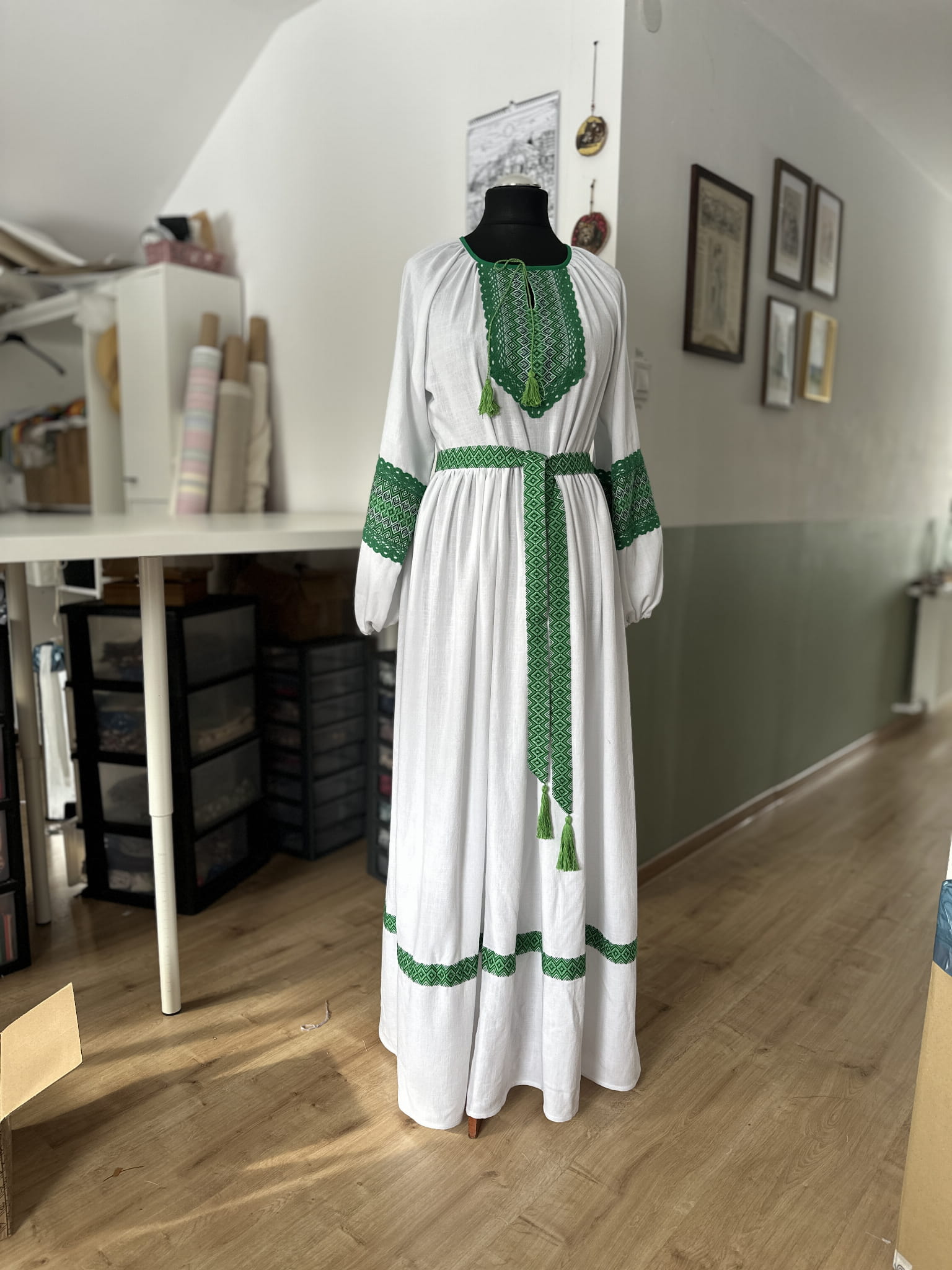 Słowiańska, lniana suknia z ozdobnymi haftami, koronką, marszczeniem w talii i gumką w mankiecie - zapewnia maksimum wygody oraz możliwość podciągnięcia rękawka by wyglądał jak 3/4. Suknia poleca się zarówno w długości do ziemi jak i 3/4.