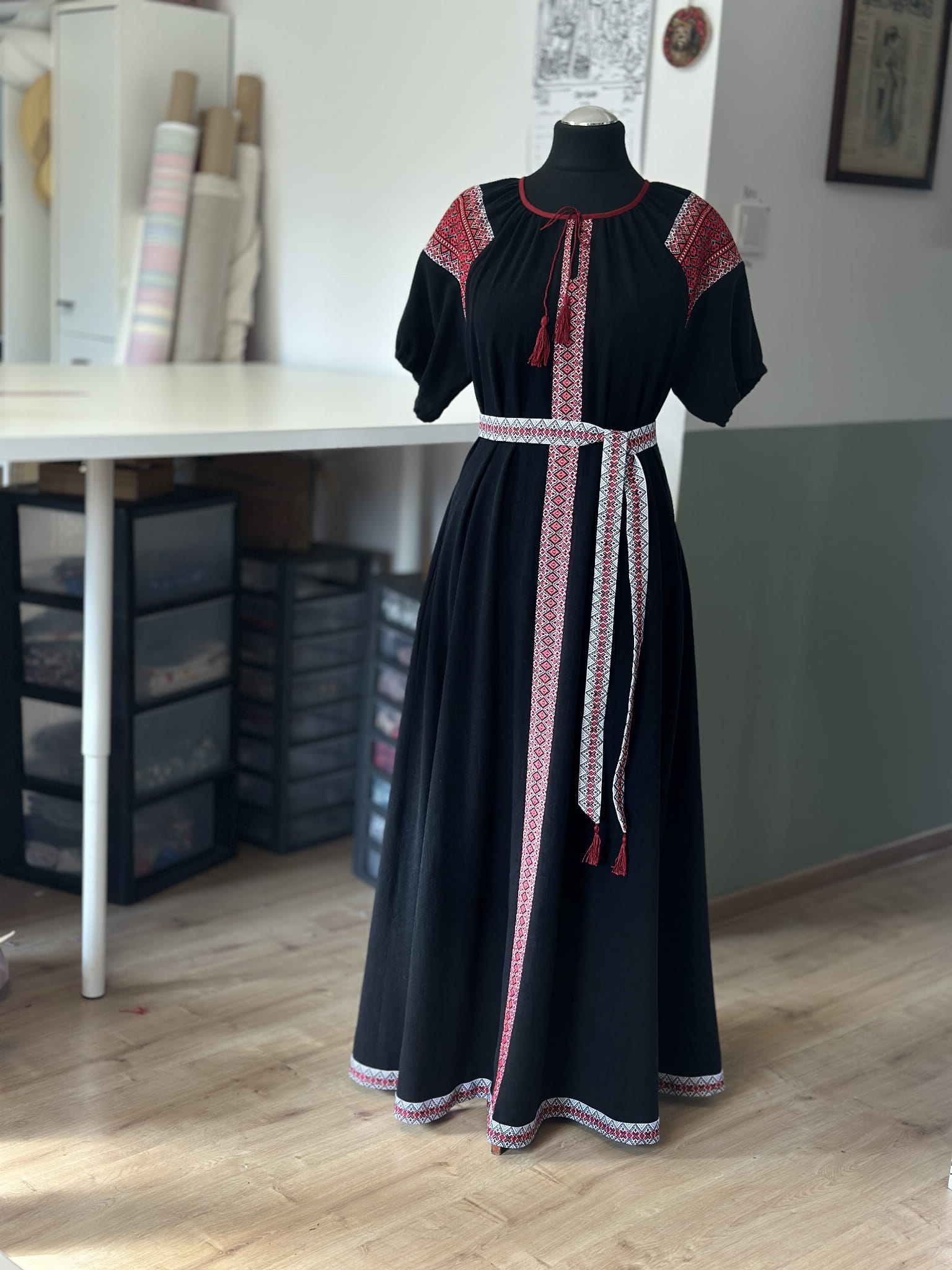Suknia ma krój raglanowy, który wygląda równie dobrze (a często nawet lepiej, bardziej folkowo) przy większym rozmiarze.