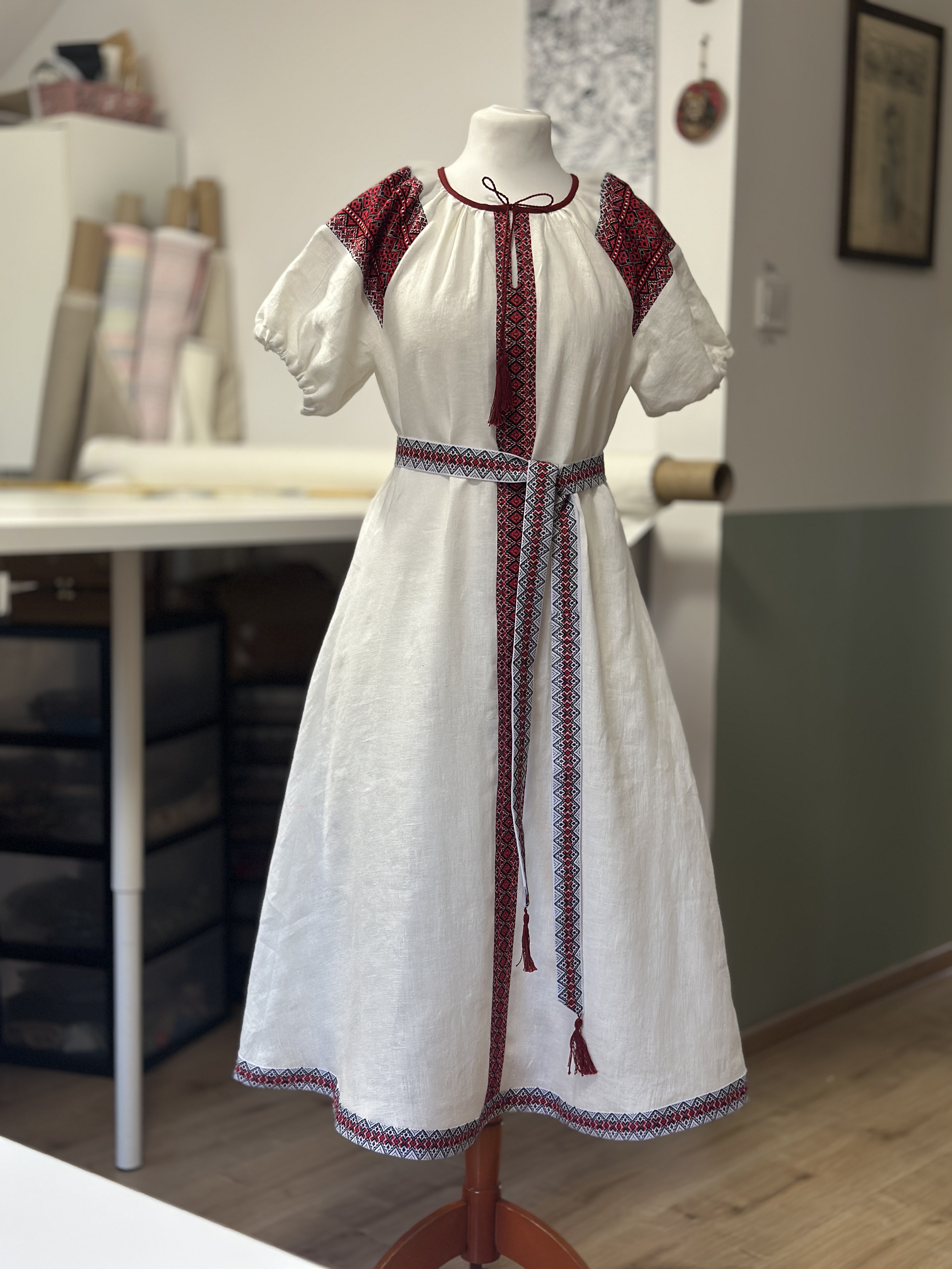 Słowiańska Suknia lniana ŚWIĘTOMIRA: z krótkim rękawkiem z bufką i pionowym pasem